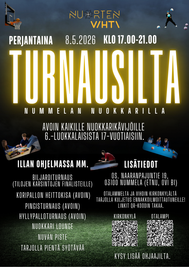 - Turnausilta pe 8.5.2026 Nummelan nuorisotilalla (kuljetukset Otalammelta ja kirkonkylältä)